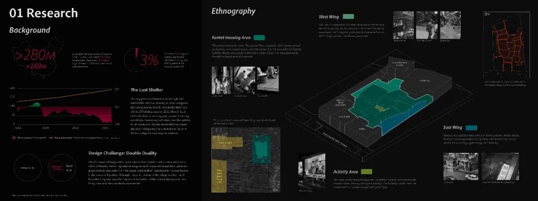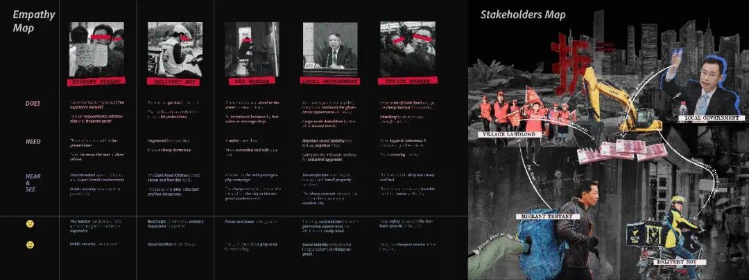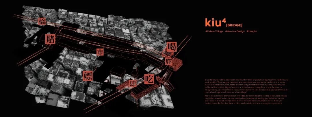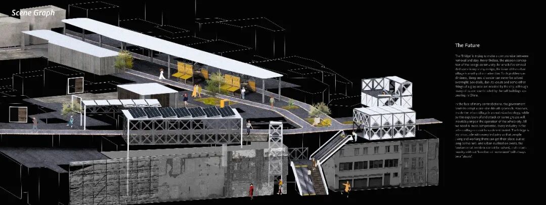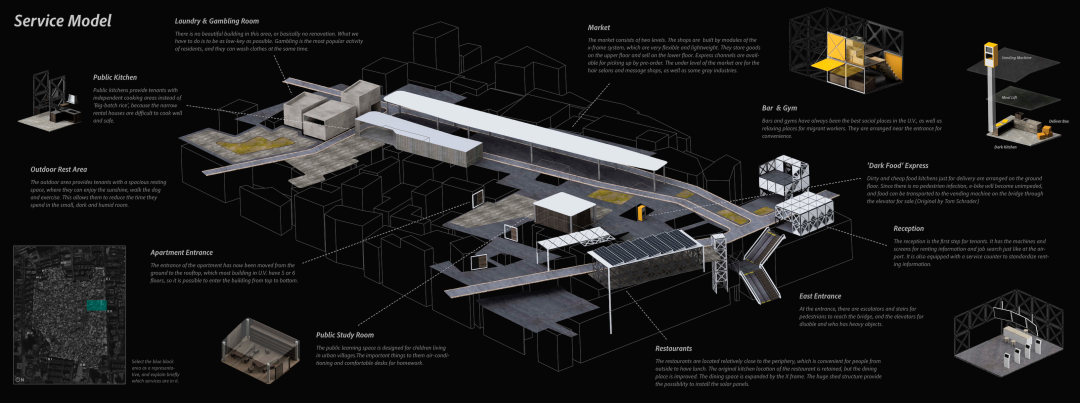 城中村所发生的只是城乡二元问题的表象,所以项目通过创造一系列的服务模式和建筑模型,构建出乌托邦式的社区,真正的核心是讽刺。