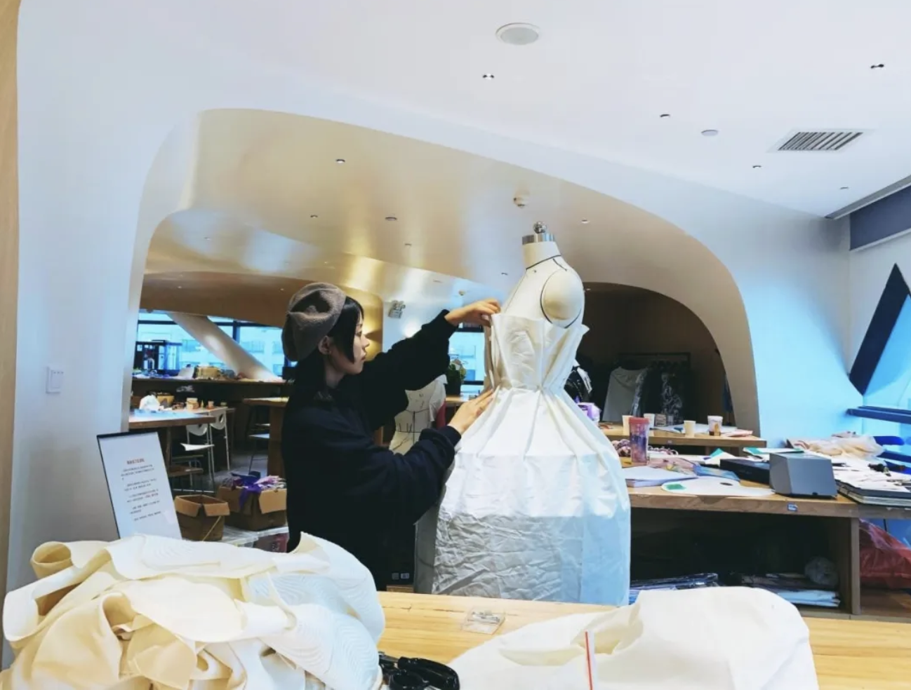 她创造性地运用交互设计以及建筑设计的知识为这个项目进行动画投影制作以及3D建模,体现一种未来趋势的虚拟服装概念。